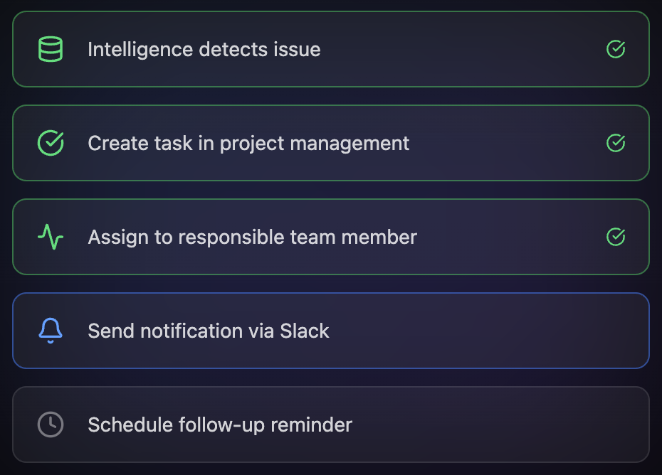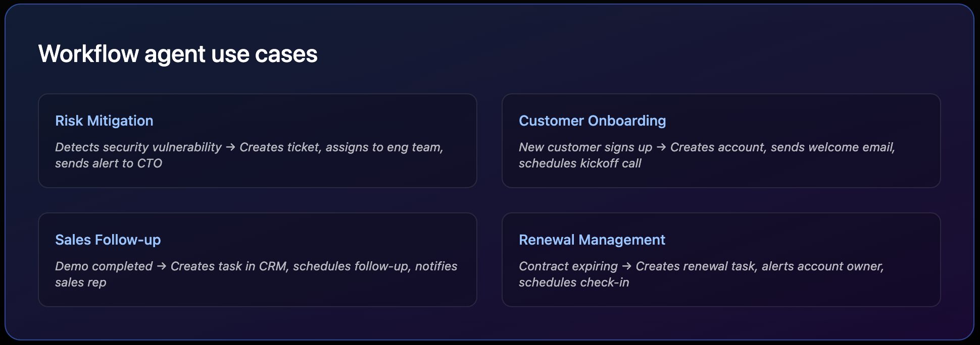 Workflow agents execute multi-step processes across your tools and systems. They handle task creation, system updates, notifications, and ensure nothing falls through the cracks.