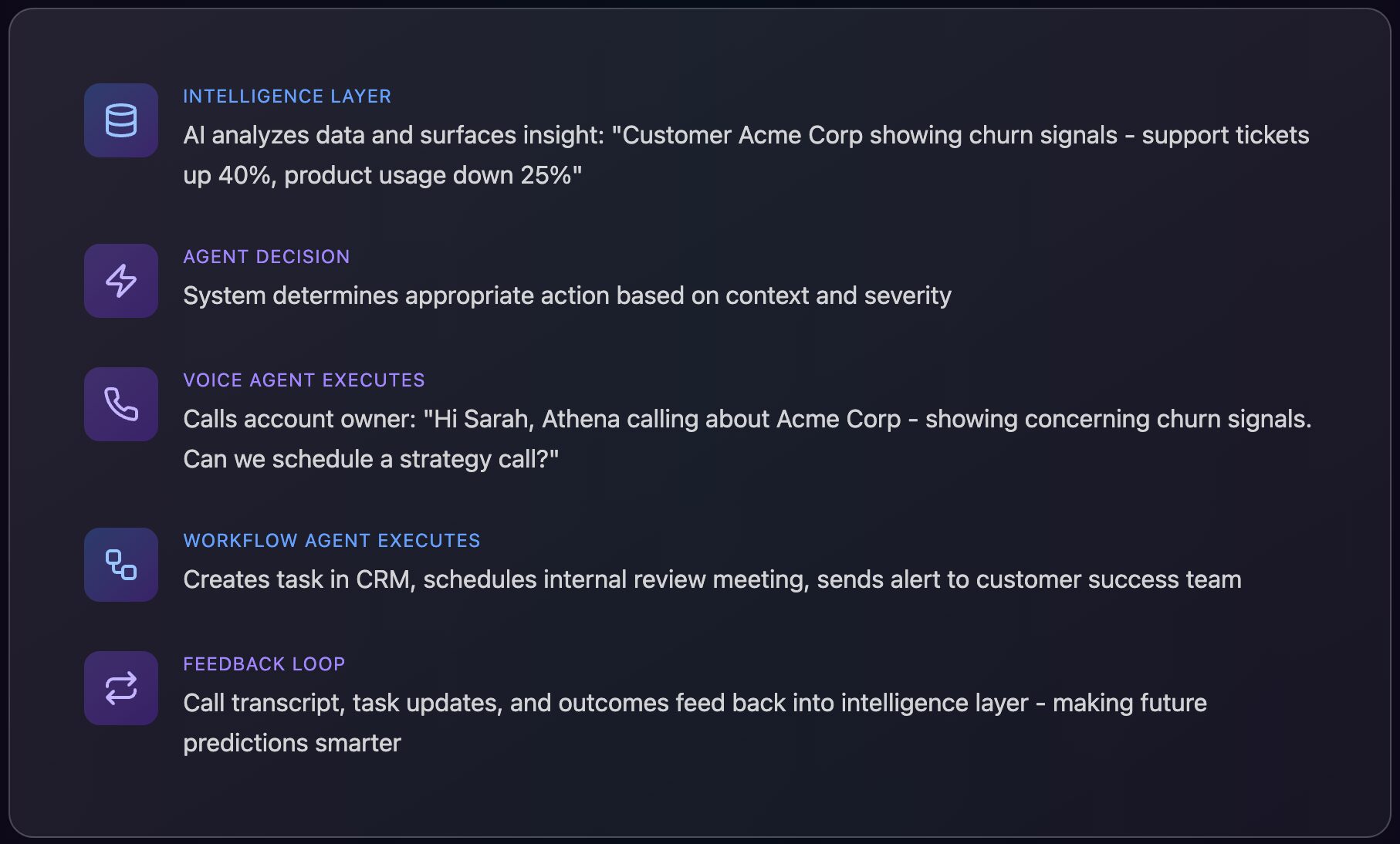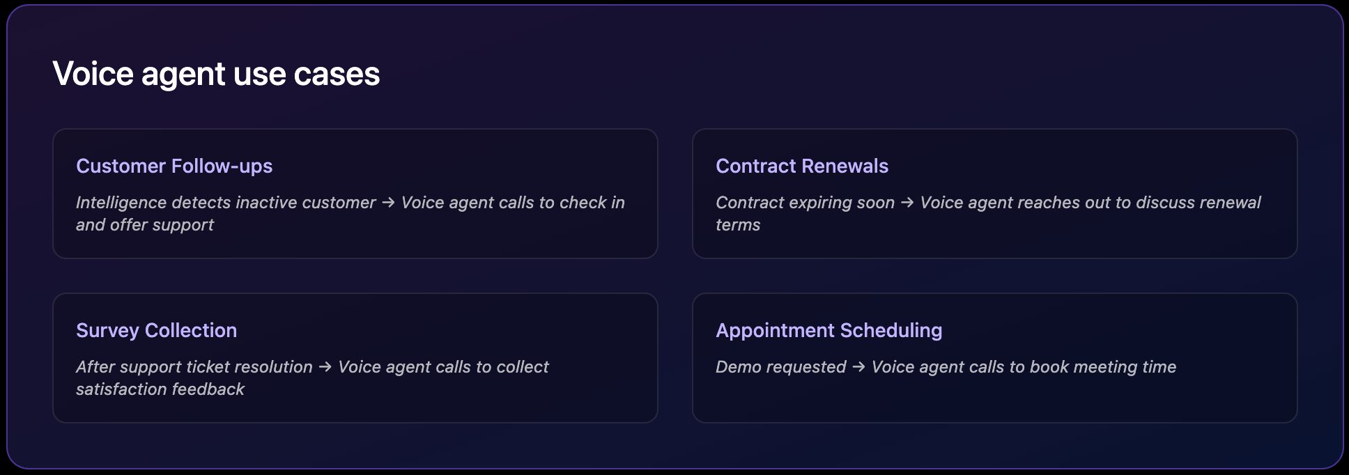Voice agents handle phone-based communication with natural, human-like conversation. They understand context from your intelligence layer and execute calls based on insights.