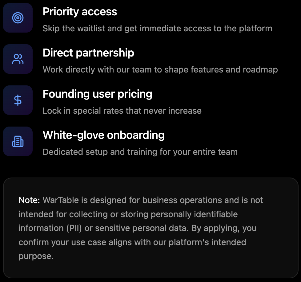 Early access members shape the product, get priority support, and lock in founding user pricing.