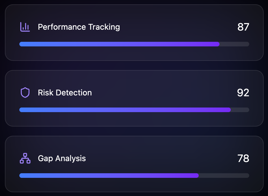 Continuous analysis surfaces diagnostics, identifies risks, reveals opportunities, and generates specific recommendations.