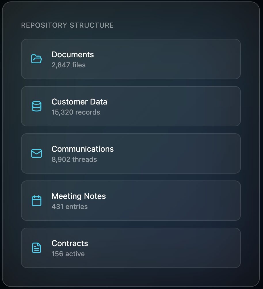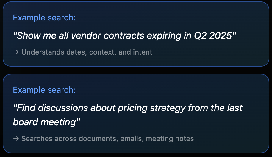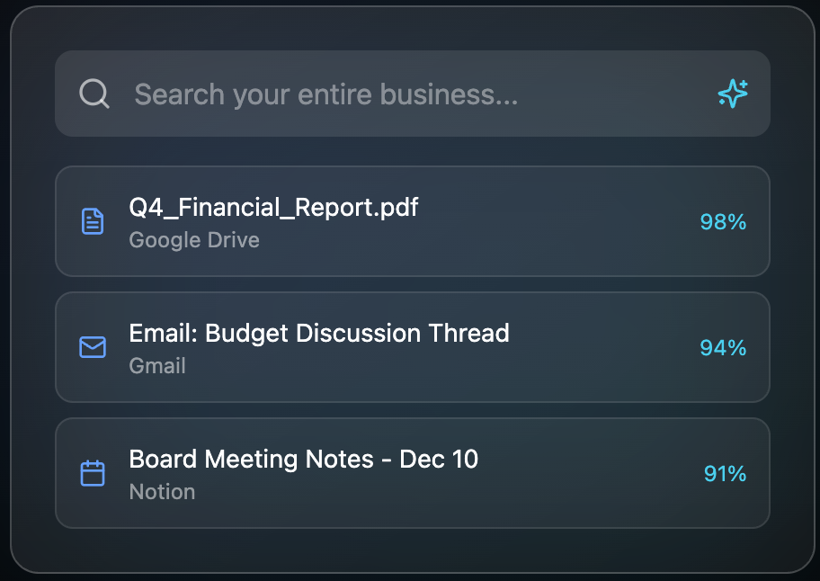 No more “Which tool was that in?” Your entire business knowledge base—documents, emails, meeting notes, data—unified and organized automatically.
