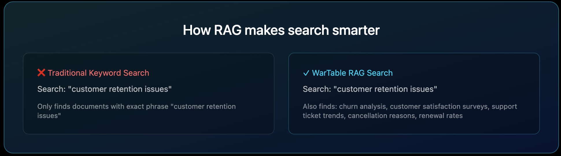 WarTable uses Retrieval-Augmented Generation (RAG) to understand meaning and context—not just exact words.